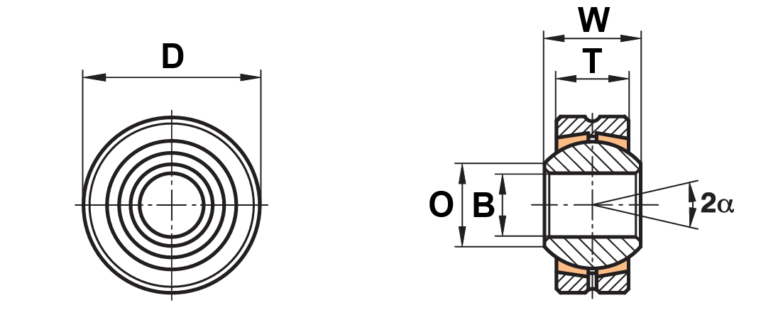 T - szerokość pierścienia zewnętrznego [mm /inch]